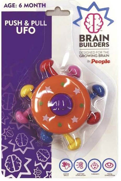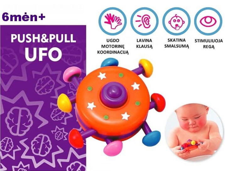 Interaktiivne BRAIN BUILDERS mäng UFO on nagu lendav taldrik kaheksa värvilise nupuga, mida saab lükata, tõmmata, krabada, vajutada ja näpistada. Teie imik avastab pidevalt midagi uut. Mänguasi teeb ka helisid. Sobib väga hästi lapsele andmiseks, kui ta hakkab huvituma ema riiete nööpidest, neid haarama ja oma väikeste sõrmedega tõmbama. Interaktiivne mäng Ufo soodustab vaimset tegevust, proovides erinevaid vajutamise ja tekkivate helide variatsioone. Kuuekuusele lapsele on Ufo täiuslik mänguasi vajalike motoorsete oskuste arendamiseks. Kui väikelaps lükkab ja tõmbab mänguasja elemente, teeb see mängulisi piko piko ja kari kari helisid, mistõttu hakkab imik mõistma puudutuse ja vastuse seost. Maandumisnupule vajutades kõlab meeldiv meloodia, mis rikastab lapse kuulmist. Mänguasi ei vaja patareisid. Ohutu ja mugav kasutada, käes hoida, BPA- ja ftalaadivaba. Vastab ASTM F963 un EN71 nõuetele. Hooldus: enne kasutamist puhastage mänguasi niiske salvrätikuga või peske õrna seebiga. Kuivatage. Mitte kasta vette. Puhastada seebiveega. Soovitatav lastele alates 6. elukuust. Hoiatus! Eemaldage toote pakend enne mänguasja lapsele andmist. Säilitage pakend. Mänguasja defekti märkamisel visake see ära ja asendage uuega. Kasutada täiskasvanu järelevalve all. Pakendi mõõtmed: 20x13x5 cm.