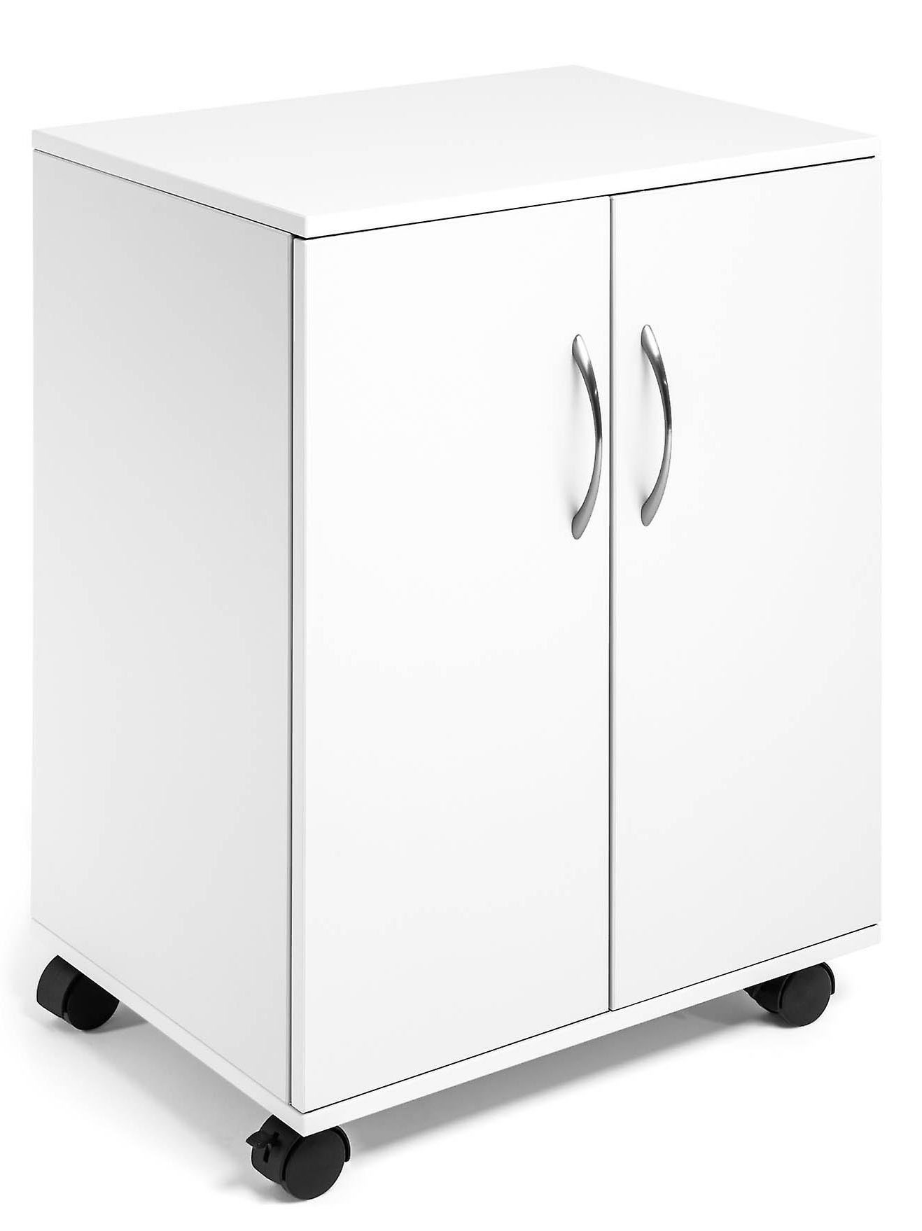 Multifunktsionaalne kapp DURABLE, suletud, valge. 2 integreeritud riiuli, 2 reguleeritava riiuli ja 2 tiibuksega. Üks riiul talub kuni 30 kg. Kvaliteetne 16 mm paksune melamiinkattega puit kaitseb kriimustuste eest. Täielikult mobiilne, 4 ratast, neist 2 piduritega stabiilsuse tagamiseks. Mõõtmed: 528 x 748 x 400 mm.