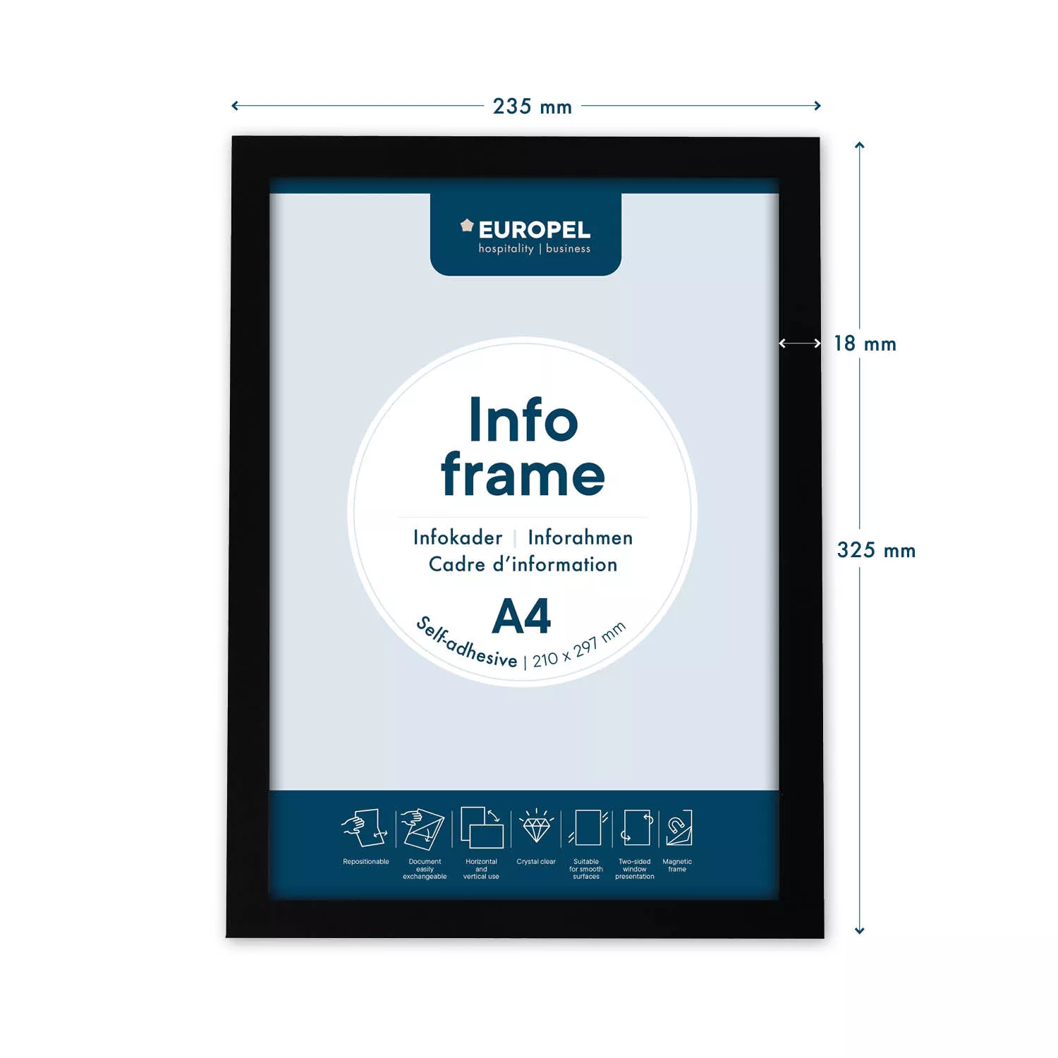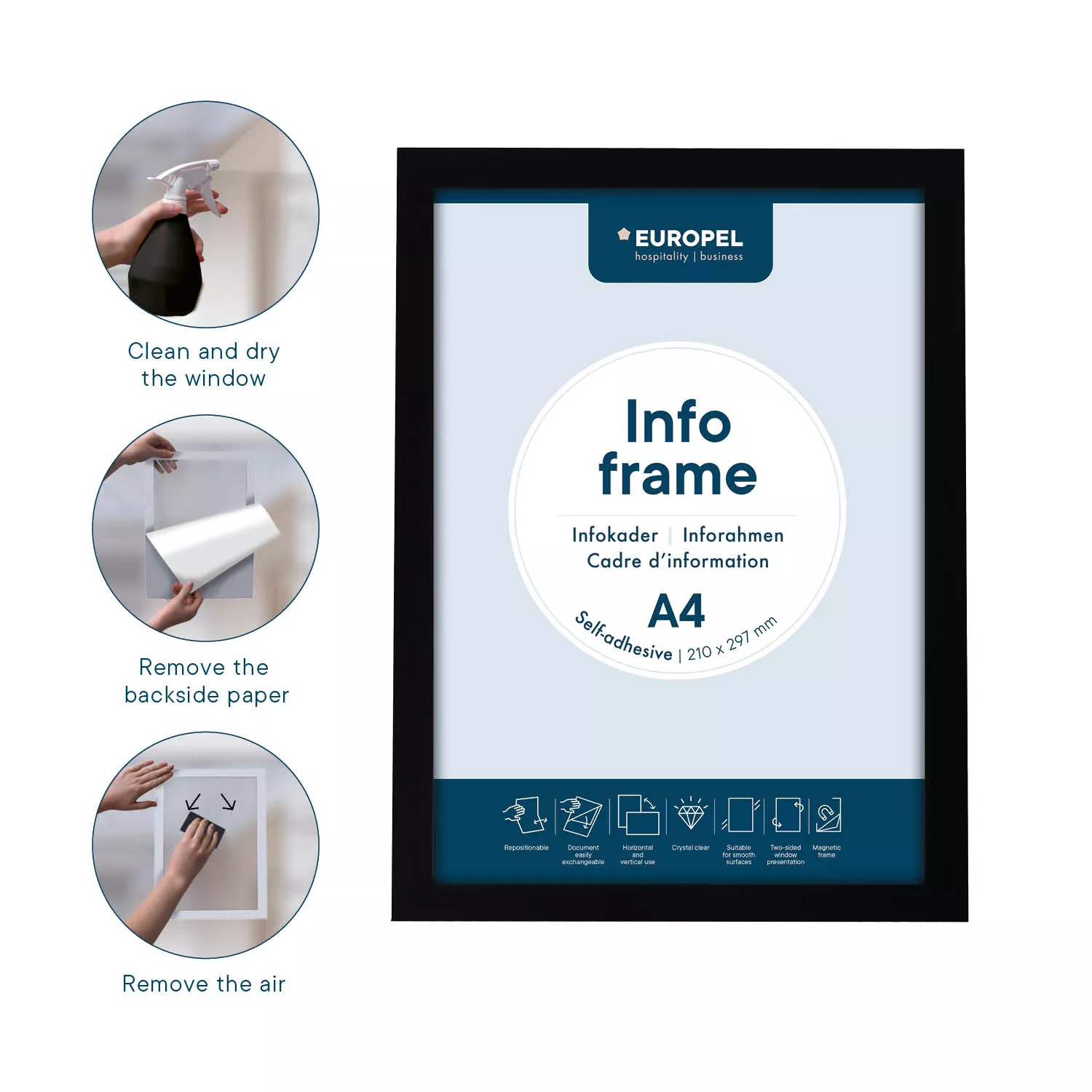 Infokraam EUROPEL, isekleepuv, selgeks info esitamiseks. Stiilne ja funktsionaalne A4 formaadis raam – suurepärane lahendus teadete, dokumentide või plakatite selgeks ja professionaalseks esitamiseks. Tänu magnetilistele servadele saab dokumente kiiresti ja mugavalt vahetada ning läbipaistev isekleepuv kile võimaldab raami kergesti kinnitada ja ümber kleepida siledatele pindadele, jätmata jälgi. Raami saab kasutada vertikaalselt või horisontaalselt ning klaasile kleepides on info nähtav mõlemalt poolt. Must raamiäär annab kontrastse ja modernse ilme, mis on nähtav mõlemalt poolt. Sobib suurepäraselt kontoritesse, müügikohtadesse, hotellidesse või asutustesse, kus on oluline info korrastatult, selgelt ja stiilselt esitada. Tehniline info: Paberi formaat: A4 (297 × 210 mm). Nähtav ala: 289 × 202 mm. Välismõõdud: 325 × 238 mm. Raami laius: 18 mm. Raami värv: must. Kinnitusviis: isekleepuv, ümberkleepitav kile. Dokumendi vahetamine: magnetilised servad Kasutamine: vertikaalne või horisontaalne. Rakendus: siledad pinnad, kahepoolne esitlus klaasil. Pakend: 2 tk.
