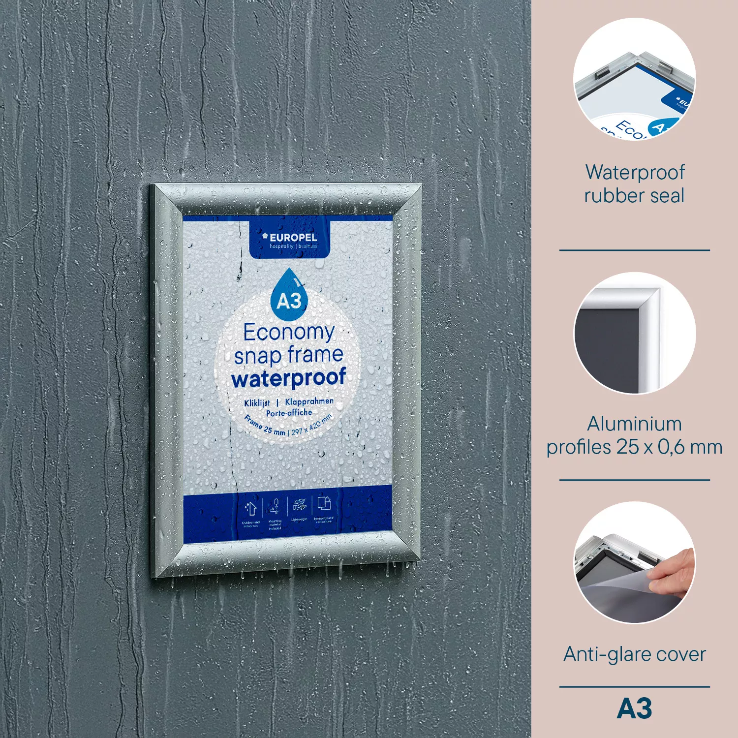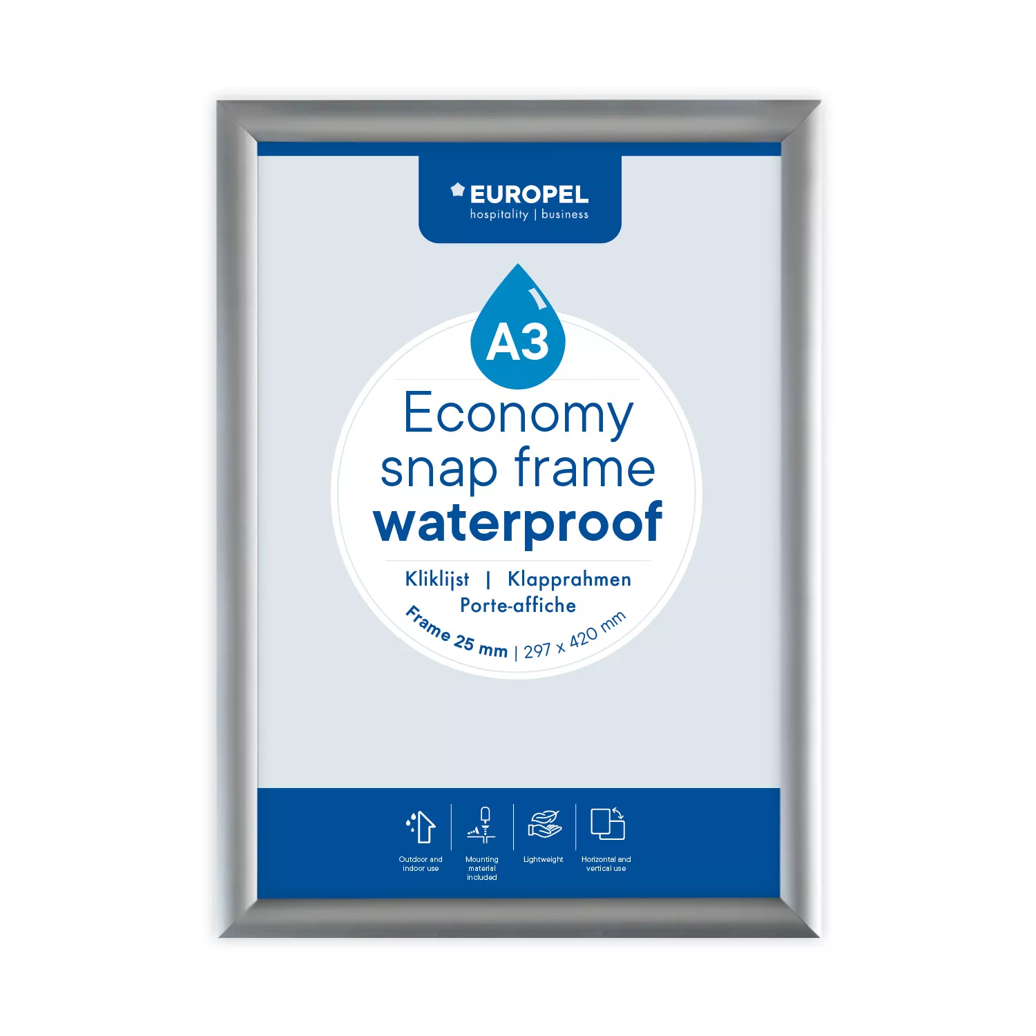 Infokraam EUROPEL, veekindel. Avasta „Snap Frame“ raam, mis sobib ideaalselt suurtele teadetele, plakatitele või reklaaminfole, mis peab olema selgelt nähtav ja atraktiivne. Raam on valmistatud 25 mm laiuse hõbedase anodeeritud alumiiniumprofiiliga, mis annab modernse ja elegantse välimuse ning sobib suurepäraselt nii sise- kui ka välitingimustesse. Tänu mugavale „Snap“ lukustussüsteemile on plakati vahetamine eriti lihtne – raami ei ole vaja seinalt eemaldada. Integreeritud kummist tihendiriba ja UV-kiirgusele vastupidav, mittepeegeldav kile kaitsevad sisu usaldusväärselt vihma, päikese ja tolmu eest, säilitades selge ja professionaalse ilme. Raam on valmistatud tugevast anodeeritud alumiiniumist, tagades vastupidavuse ja esteetilisuse. Komplektis on kinnitusdetailid, mis võimaldavad paigaldada nii vertikaalselt kui ka horisontaalselt. Sobib suurepäraselt: restoranide menüüdele, kontorite infotahvlitele, avalikele teadetele või reklaamile välitingimustes. Miks valida A3 „Snap Frame“ raam: Veekindel tihendiriba tagab täieliku kaitse; Kaasaegne 25 mm anodeeritud alumiiniumprofiil; Kiire plakati vahetamine „Snap“ süsteemiga; UV-kile kaitseb tuhmumise ja peegelduste eest; Sobib kasutamiseks nii sees kui väljas. See raam on usaldusväärne, stiilne ja funktsionaalne valik professionaalseks info esitamiseks igas keskkonnas.