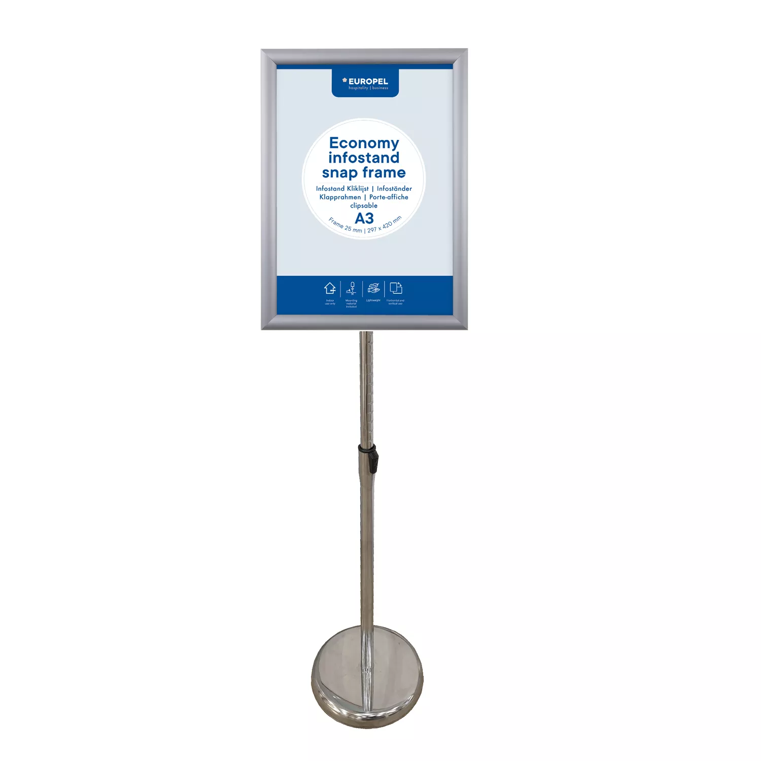 Ökonoomne infotahvel EUROPEL A3 formaadis raamiga. See tahvel on ideaalne lahendus info, plakatite või teadete professionaalseks ja esteetiliseks esitamiseks. Tahvel on komplekteeritud A3 formaadis 25 mm alumiiniumraamiga, mille profiilid on nurkades ühendatud ning millel on Easy-Click süsteem, mis võimaldab plakateid või infolappe kiiresti ja mugavalt vahetada. Raam on valmistatud anodeeritud alumiiniumist, millel on tugev plastalus. Läbipaistev, mittepeegeldav PVC kaitsekate kaitseb plakatit tolmu, niiskuse ja kriimustuste eest, säilitades puhta ja professionaalse ilme. Tahvel on kergesti kokkupandav ning pakendis on detailsed kokkupaneku juhised. Raami saab kasutada nii vertikaalselt kui ka horisontaalselt, seega sobib see erinevateks info esitamise vajadusteks. Suurepärane valik kontoritesse, poodidesse, messidele, hotellidesse, konverentsidele või asutustesse, kus on vajalik korrastatud, selge ja esinduslik info esitamine. Tehniline info: suurus: A3. Raami tüüp: Easy-Click, nurkades ühendatud. Materjal: anodeeritud alumiinium plastalusega. Kaitsekate: läbipaistev, mittepeegeldav PVC. Asend: vertikaalne või horisontaalne. Värv: hõbedane.