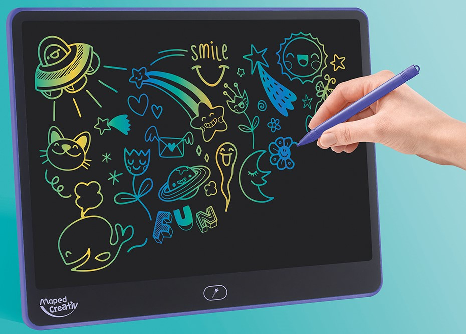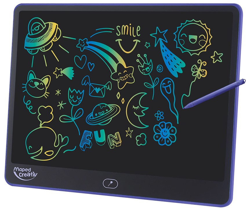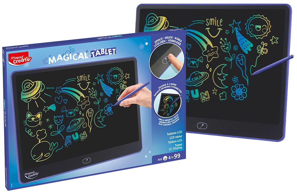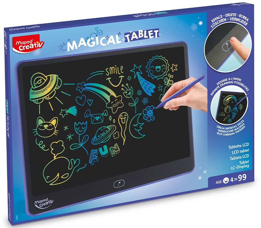 Joonistustahvliga „Maped Creativ Magical LCD“ saavad lapsed lõputult joonistada ja kirjutada – ning selleks pole vaja paberit, pliiatseid ega mingeid muid piiranguid! Suurel LCD-ekraanil ilmub iga joon koheselt kolmes värvis, luues tõeliselt maagilise efekti. Kaasasolev kirjutuspulk võimaldab lastel vabalt luua ning töö kustutatakse ühe nupuvajutusega. Tagaküljel asuv mugav integreeritud lukustussüsteem kaitseb juhusliku kustutamise eest. Kerge, kaasaskantav ja mustust mitte tekitav tahvelarvuti sobib suurepäraselt meelelahutuseks teel olles. Kirjutuspulk on kinnitatud elastse paelaga, nii et see ei kao kunagi ära. Soovitatav lastele alates 4. eluaastast. Hoiatus! Ei sobi alla kolmeaastastele lastele. Väikesed osad, lämbumisoht. Kasutada täiskasvanu järelevalve all. Kasutab 1xCR2025 (3V) patareid (komplektis). Paigaldage patareid nii, nagu on näidatud pakendil oleval pildil. Patareide vahetamisel kasutage ristpeaga kruvikeerajat. Ärge segage vanu ja uusi patareisid, kasutage neid sihipäraselt. Vahetage patareisid ainult täiskasvanu järelevalve all. Ärge visake kasutatud patareisid olmeprügi hulka, vaid utiliseerige need vastavalt eeskirjadele. Tahvli mõõtmed: 330x250 mm.