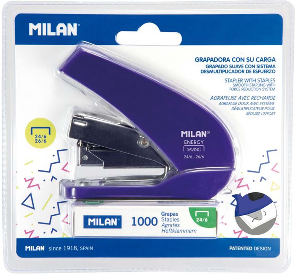Energiasäästlik kompaktne klammerdaja koos klambritega MILAN Acid, kuni 20 lehte, sinine