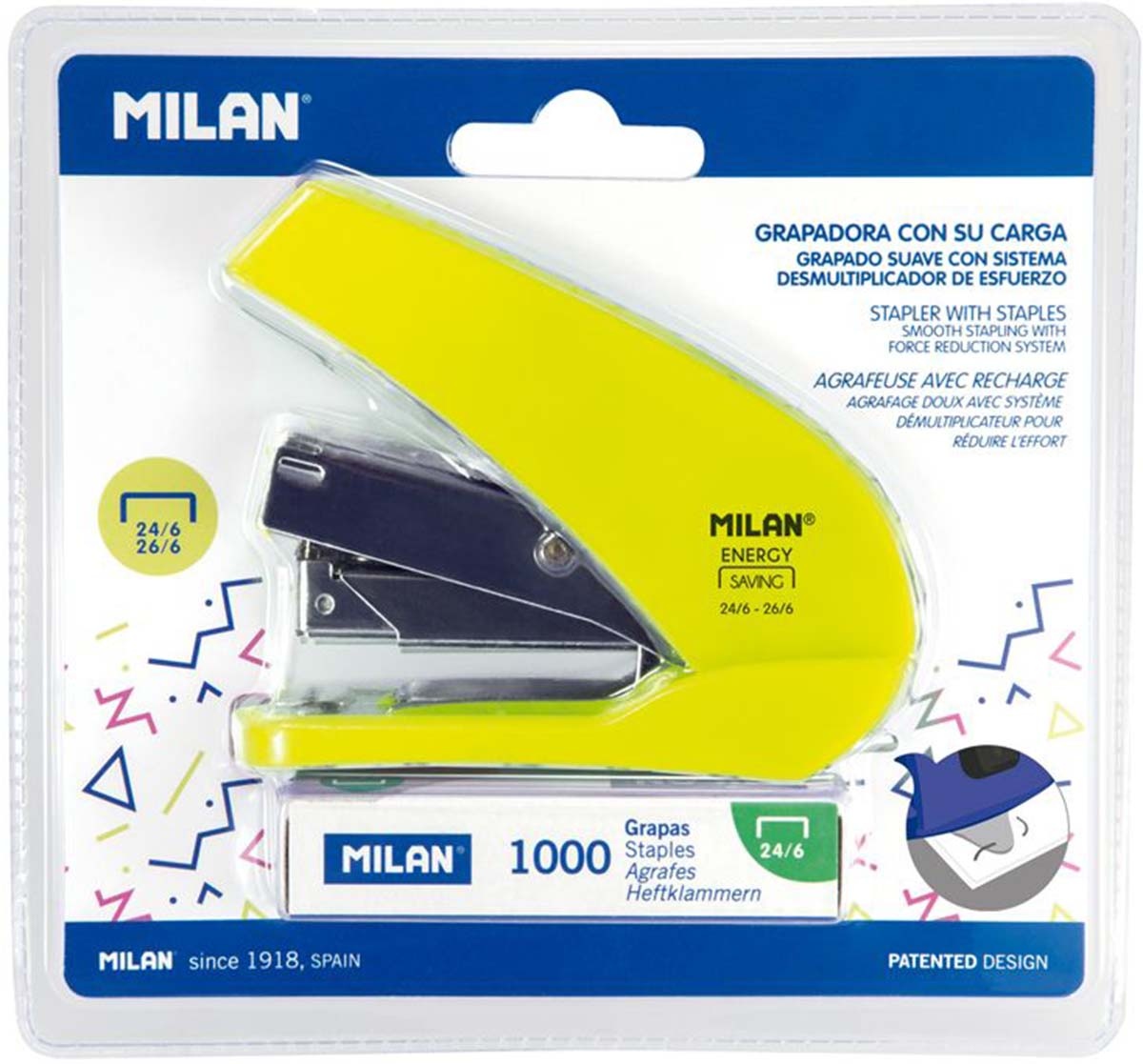 Energiasäästlik kompaktne klammerdaja koos klambritega MILAN Acid, kuni 20 lehte, kollane