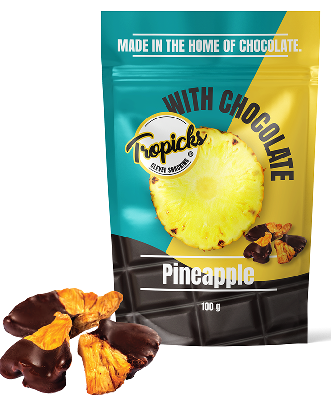 Looduslikud kuivatatud ananassid tumedas šokolaadis TROPICKS, 100 g