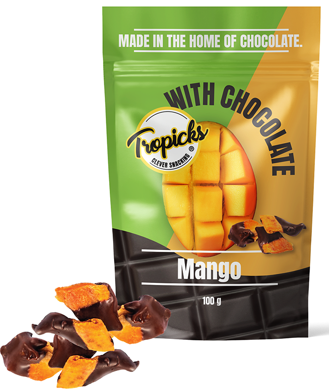 Looduslikud kuivatatud mangod tumedas šokolaadis TROPICKS, 100 g