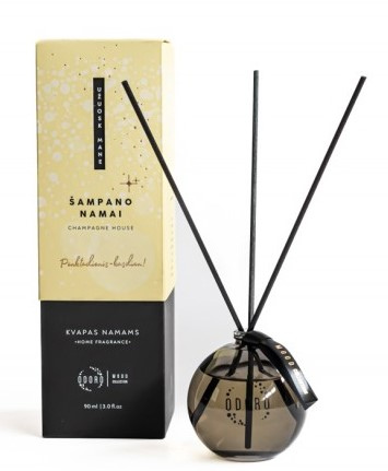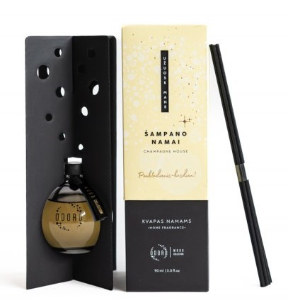 Pulkadega kodulõhn ODORO, Šampanja kodu (Šampano namai), 90 ml. Leedu käsitööna valminud kodulõhn. Klaasist ümar ODORO pudel, mis on täidetud 90 ml aroomiõliga, komplektis on 10 musta uue tehnoloogiaga mitmekiudset pulka, mis tagavad lõhna veelgi parema leviku. Aroomiõli on kohandatud kodu või muude ruumide lõhnastamiseks. Meeldiva aroomiga, tugevalt kontsentreeritud. Hästi tuntav ja kergelt keskkonnas leviv. Suurepärane atmosfääri parandamise vahend ja interjööri detail. Juhiste järgi kasutamisel jagub lõhna 2–4 kuuks. Soovitatav on kasutada 3–4 pulka korraga, pöörates neid iga paari päeva tagant. Kui pulgad lakkavad lõhna levitamast ka pärast pööramist, asendage need uute, veel kasutamata pulkadega. MOOD kollektsiooni pudelis peitub aroomi ja selle pakutava meeleolu valem sulle ja sinu kodule. Kodudele, mis vajavad iga päev vähemalt piiska pidulikkust ja muretust. Täidan need sooviga naeratada ja rõõmustada iga elupüitke üle, nii saad kainelt nautida oma erilist elu ja seda, mis sul on. Maht 90 ml.