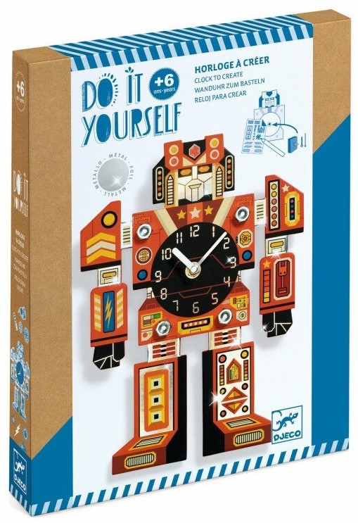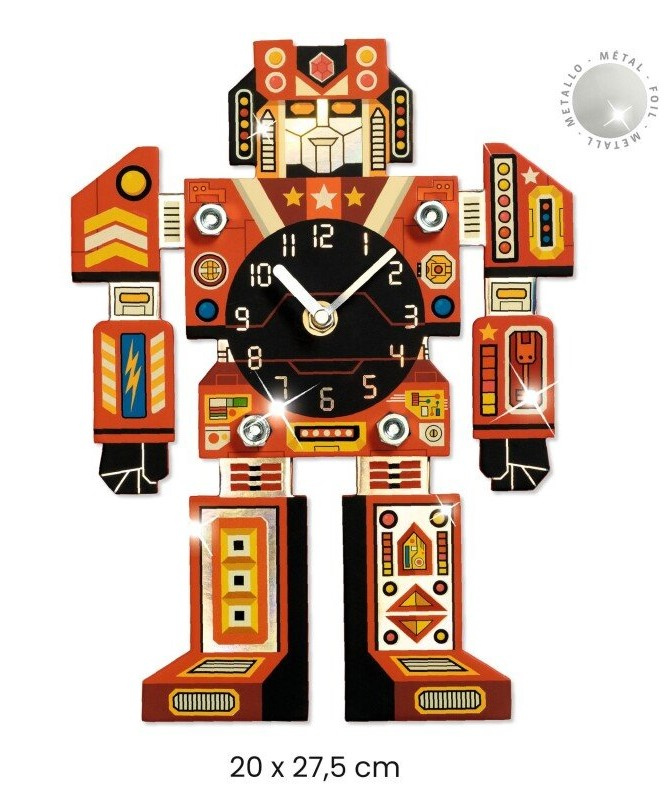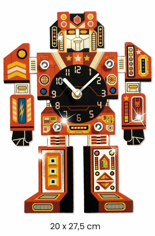 Loov kella valmistamise komplekt, mis kutsub lapsi sukelduma fantaasiamaailma ja looma ise oma robot-kella! Kell tuleb kokku panna ja kaunistada enam kui 80 kleebise ja muu lisandiga. Väikesed kunstnikud saavad kaunistada kella nii, nagu neile kõige rohkem meeldib. Kõige lõbusam osa on kruvide ja mutrite ühendamine, kui robot laste käte vahel järk-järgult ellu ärkab. Lõpuks, lisades kellamehhanismi, tekib tuppa imeline dekoratsioon, mis mitte ainult ei kauni, vaid näitab ka täpselt aega. See on kaasahaarav tegevus, mis ühendab loomingulise dekoreerimise ja konstrueerimise. Komplektis on 5-osaline kokkupandav kell, 3 kleebistelehte, hääletu kellamehhanism, 2 kellaosutite komplekti, 4 kruvi, 4 mutrit ja konks. Töötab 1.5V AA-LR06 patareiga (ei ole komplektis). Sisestage patareid vastavalt pakendil olevale joonisele. Ärge segage vanu ja uusi patareisid, kasutage neid sihtotstarbeliselt. Vahetage patareisid ainult täiskasvanu järelevalve all. Ärge visake kasutatud patareisid olmeprügi hulka, vaid utiliseerige need vastavalt eeskirjadele. Soovitatav lastele alates 6. eluaastast. Hoiatus! Ei sobi alla kolmeaastastele lastele. Väikesed osad, lämbumisoht. Kasutada täiskasvanute järelevalve all.