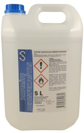 Kiireks pindade ja seadmete desinfitseerimiseks rahvatervise asutustes ja avalikes asutustes, toiduainetetööstuses ja toitlustusettevõttes ning tööriistade ja instrumentide desinfitseerimiseks juuksuritöökodades, ilusalongides. Tüüp 2 ja 4 biotsiid. Pindade desinfektsioonivahend on valmistatud denatureeritud etüülalkoholi baasil. Väikeste pindade, tööriistade, inventari, välja arvatud meditsiiniseadmete desinfitseerimiseks tervishoiu- ja avalikes asutustes, toiduainetetööstuses ja toitlustusettevõtetes ning koduses majapidamises. Ei tohi otseselt toiduga kokku puutuda. KASUTAMINE: SPIRITUSEGA DESINFEKTSIOONIVAHEND PINDADELE on kasutusvalmis. Desinfitseeritav pind peab olema puhas. Instrumente, tööriistu ja pindu pärast desinfitseerimist pesta ei ole vaja. Spiritusega desinfektsioonivahendi saastumise märkide ilmnemisel (helveste tekkimine, värvuse muutus) tuleb see uue vastu vahetada. Pihustada pinnale 25–30 cm kauguselt või pühkida puhta salvrätikuga, mis on niisutatud SPIRITUSEGA DESINFEKTSIOONIVAHENDIGA, nii et pind oleks täielikult märg. Pihustada mitte rohkem kui 50 ml/m². Toimeaeg 5 min. Ilusalongides, juuksuritöökodades asetada puhtalt puhastatud ja pestud kasutatavad tööriistad 5 minutiks spiritusega desinfektsioonivahendisse, seejärel võtta välja ja kuivatada või pühkida kuivaks ühekordse salvrätikuga. Tööriistad, mida ei saa leotada, pihustada üle või pühkida niisutatud salvrätikuga, seejärel kuivatada või 5 minuti pärast pühkida kuivaks ühekordse salvrätikuga. Seadmed või nende osad pihustada üle 25–30 cm kauguselt või pühkida niisutatud salvrätikuga, seejärel kuivatada või 5 minuti pärast pühkida kuivaks ühekordse salvrätikuga. Fungitsiidse või pärmseente saastumise korral on toimeaeg 15 min. Mükobakteritsiidse või viirusvastase saastumise korral on toimeaeg 60 min. Maht 5 L. Hoida lastele kättesaamatus kohas.