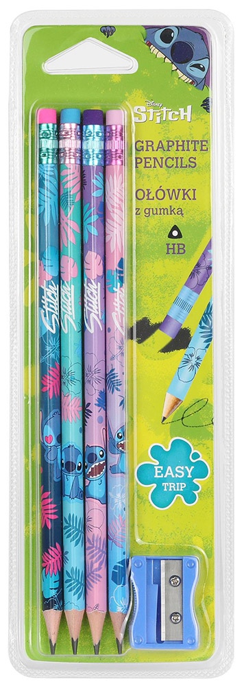 Pliiatsid kustutuskummidega DISNEY Stitch Blue, kolmnurksed, teritajaga, HB, 4 tk