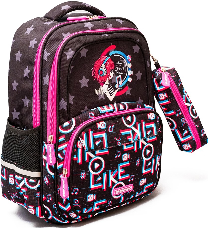 Erich Krause Top Blogger seljakott. Mahukas seljakott, valmistatud kulumis- ja külmakindlast 900D polüestrist polüuretaanimmutusega. Seljakotti kaunistab pinal-võtmehoidja. Seljakoti sees on 2 mahukat sektsiooni A4+ formaadis vihikutele ja õpikutele. Põhisahtli sees on sülearvuti sahtel, mille diagonaal on kuni 15,6 tolli. Välisküljel on kaks lukuga esitaskut, lisaks klapiga tasku ning veel kaks elastse ribaga küljetaskut veepudeli või vihmavarju jaoks. Selles mudelis on õlarihmadesse integreeritud helkurelemendid. Seljakotti on mugav kanda tänu ergonoomilisele ErgoLine® System seljatoele. Selle pehmed padjad jaotavad seljakoti raskust ja vähendavad lapse selgroo koormust. „Hingav“ AirMesh kangas seljapatjade vahel ei lase niiskusel koguneda ning pehmed S-kujulised rihmad ei suru õlgadele. Sellel mudelil on suur pehme kandesang ning lisasang. Sangade ja rihmade kinnitused on tugevdatud lisõmblustega. SchoolLine seljakott on optimaalne valik kooli. Mõõdud: 42x31x14,5 cm. Maht 20 liitrit, kaal 770 g.